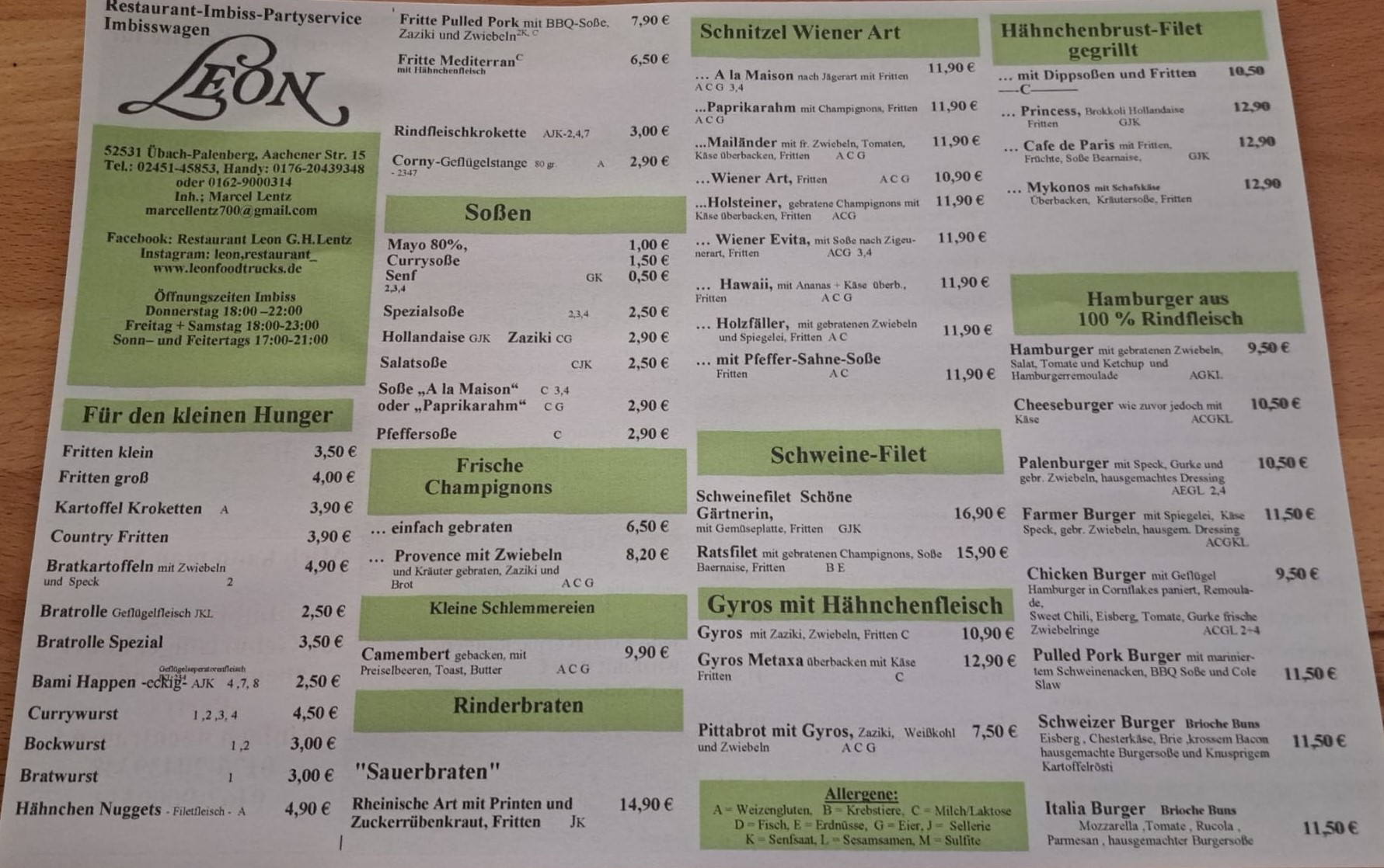 Entdecken Sie die vielfältige Speisekarte des Leon Imbiss´. Von herzhaften Snacks bis zu köstlichen Hauptgerichten - hier ist für jeden Geschmack etwas dabei! Genießen Sie unsere Auswahl an traditionellen deutschen Gerichten, die frisch zubereitet und mit Liebe serviert werden. Unsere Speisen sind ideal für ein schnelles Mittagessen oder einen gemütlichen Abend mit Freunden und Familie. Kommen Sie vorbei und lassen Sie sich von unserem freundlichen Team und der tollen Atmosphäre begeistern!