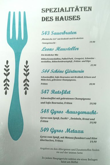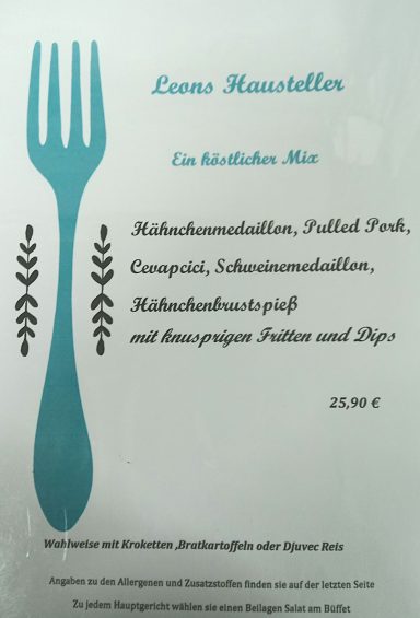 Entdecken Sie die vielfältige Speisekarte des Leon Restaurants, die köstliche Gerichte für jeden Geschmack bietet. Von traditionellen deutschen Klassikern bis hin zu modernen Interpretationen ist für jeden Feinschmecker etwas dabei. Unsere sorgfältig zubereiteten Speisen verwenden frische, regionale Zutaten und bringen den Geschmack Deutschlands direkt auf Ihren Teller. Lassen Sie sich von unseren hausgemachten Spezialitäten verwöhnen – sei es ein herzhaftes Schnitzel oder ein veganes Gericht. Kommen Sie vorbei und erleben Sie kulinarische Höhepunkte in einem einladenden Ambiente.